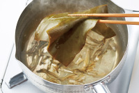 ②の鍋を弱火(5分以上かけて煮立つ程度の火加減)にかけ、ふつふつと小さな泡が立ち、煮立つ直前になったら、だし昆布を取り出します。