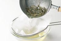 軽く煮立てながらアクを取り、約5分煮ます。ペーパータオルなどで濾して煮干しを取り除きます。
