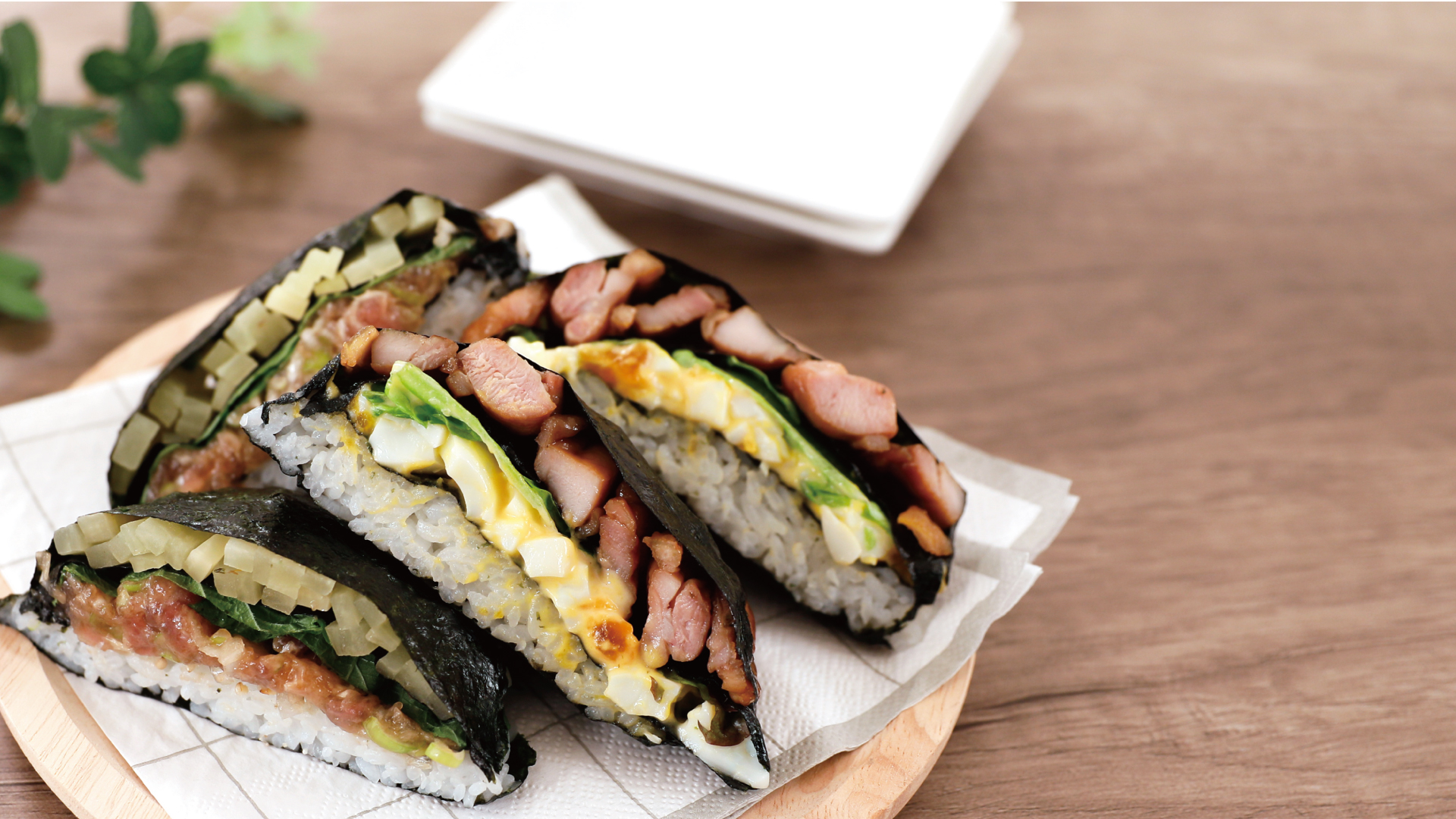 たたみおにぎりを斜めに半分に切って器に盛る。