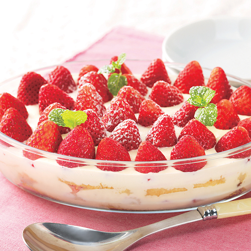 器にカステラを敷き、2)といちごの順に2回交互に重ね入れる。冷蔵室で約2時間冷やす。