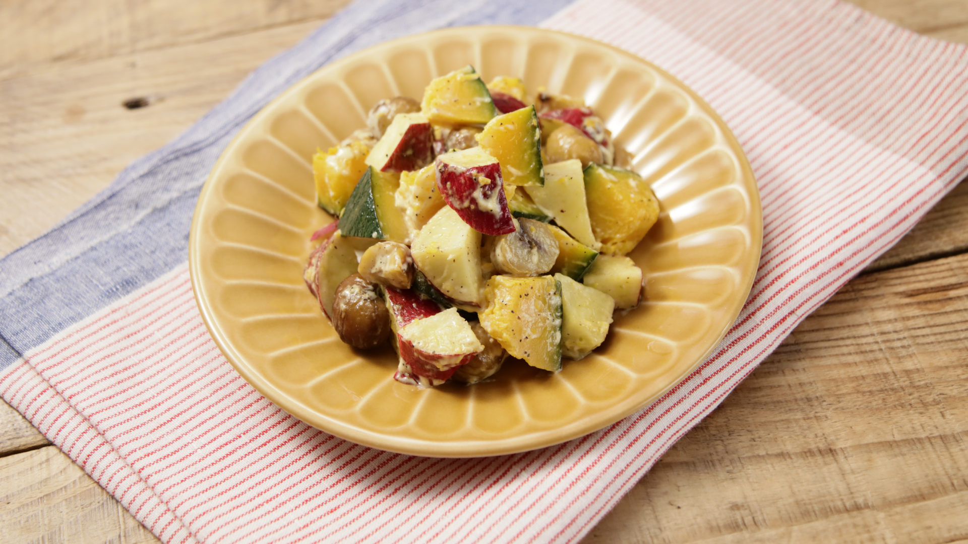 あら熱が取れたら甘栗を入れ、マヨネーズ・レモン汁を加える。塩、こしょうで味をととのえ、冷蔵庫で冷やす。