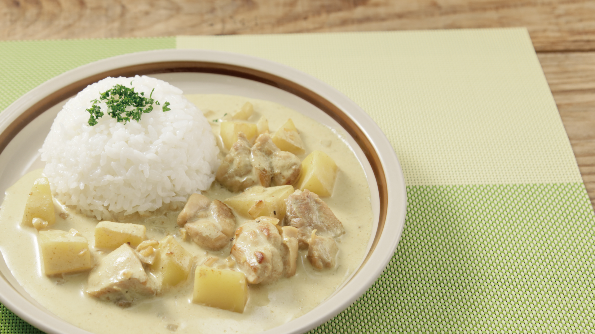 鶏もも肉は一口大に切る。じゃがいもは乱切りに、玉ねぎは1cm角に切る。 ピーナツは砕く。