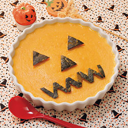 冷凍かぼちゃは耐熱皿に並べてラップをし、500wの電子レンジで約3分加熱し、熱い間に皮を取って果肉をボウルに入れてフォークの背でつぶし、シナモンパウダーと1/2カップの牛乳を加えて混ぜ合わせる。皮は冷まして目や口型に切る。