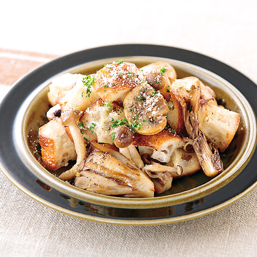 フライパンにAを入れて炒め、香りが出てきたら、1)のきのこを加えて色づくように焼く。フランスパンを加えて転がしながら全体を焼き、ハーブソルトで味をととのえる。