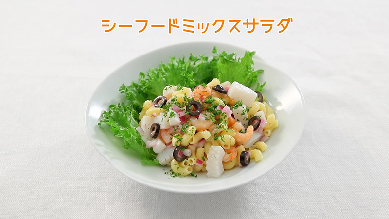 沸騰したお湯でトップバリュ サラダマカロニをゆでる。マカロニをボウルに取り出し、そのお湯に白ワイン、トップバリュ シーフードミックスを加え火を通し、ボウルに取り出す。