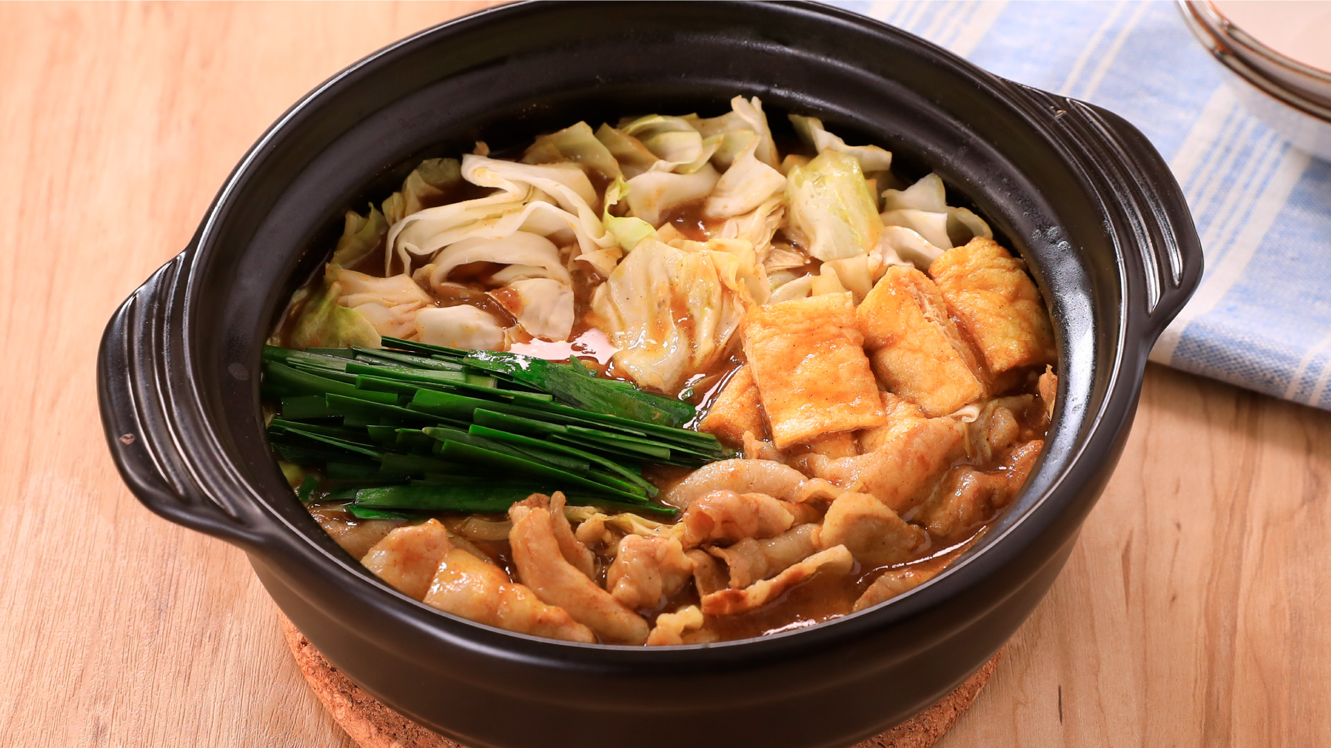 鍋に寄せ鍋つゆ、カレールウを入れて火にかけ、沸騰したら、豚肉を加え、豚肉の色が変わったら、キャベツ、油揚げ、にらを加えて煮込む。