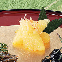 1)の数の子の汁気をふき、2)に漬けて味をなじませる。食べやすく切って糸かつおをのせる。