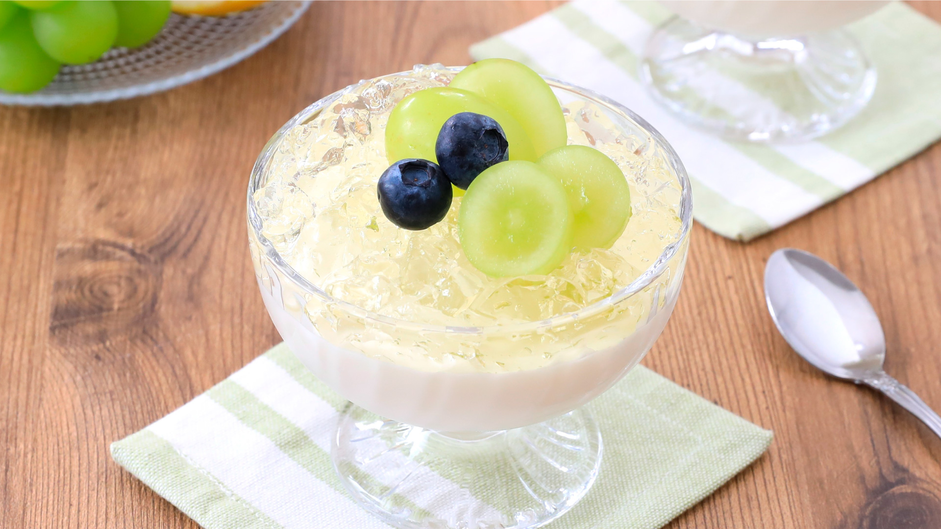 マスカットを半分に切る。3に4のゼリーをのせ、マスカット、ブルーベリーを飾る。