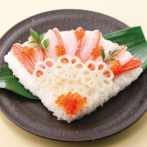 器に2)のすし飯を盛って具材をのせ、しょうゆとわさびを添える。