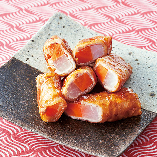 1)を芯にして、豚肉を斜めに少しずつずらしながら巻きつける。同様に6本作り、全体に片栗粉を薄くまぶす。