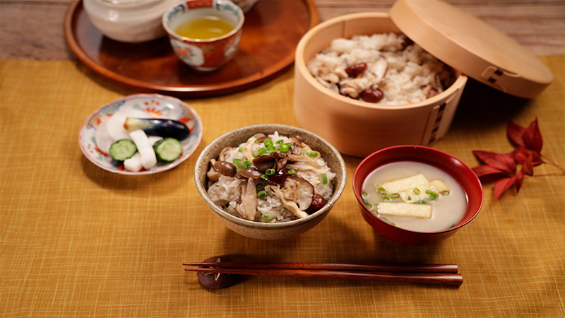 鶏もも肉と油あげは細かく刻む。しいたけは石づきを取って軸とかさに分け、軸は手で細かく裂き、かさは薄切りにする。しめじ、まいたけも手で細かく裂く。