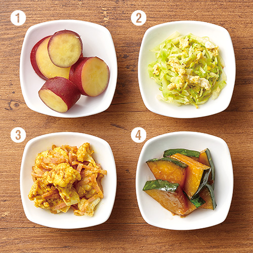 かぼちゃは5mm厚さに切り、水・しょうゆ、砂糖とともに耐熱容器に入れる。バターを散らし、電子レンジで約4分加熱する。