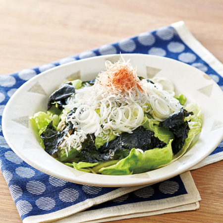 焼きのり(全形) 1枚 レタス 3枚 玉ねぎ 40g [A] エキストラバージンオリーブオイル 大さじ1 レモンの搾り汁 小さじ2 しょうゆ 小さじ1 しらす干・長ねぎ(小口切り) 各20g かつおぶし 適量