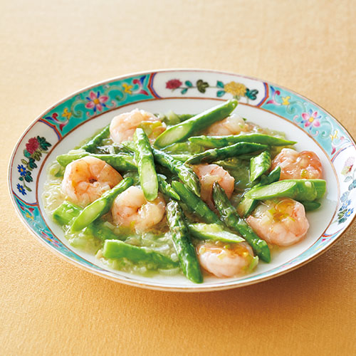 グリーンアスパラガス 6本 むきえび 8尾 長ねぎ(みじん切り) 1/2本分 しょうが(みじん切り) 小さじ2 [A] 片栗粉・酒 各小さじ1 塩 少々 サラダ油・塩 各適量 [B] 中華スープ 1/2カップ 酒 大さじ1 砂糖 小さじ1 [C] 片栗粉・水 各小さじ2 ごま油 小さじ1