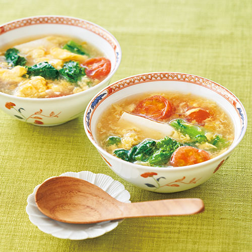 菜の花 8本 ミニトマト 5個 絹ごし豆腐 100g 溶き卵 2個分 塩 適量 鶏がらスープ 2カップ [A] 酒 大さじ1/2 しょうゆ 小さじ1 塩 小さじ1/4 [B] 片栗粉・水 各大さじ1 ごま油 小さじ2