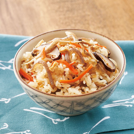 米(洗ったもの 2合分 ごぼう・にんじん・こんにゃく・油揚げ 各30g [A] 干ししいたけ 2枚 水 1/2カップ [B] 干ししいたけのもどし汁(濾したもの) 適量 しょうゆ(あれば薄口)・みりん 各大さじ2と1/2 だし汁 適量