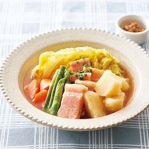ブロックベーコン 200g じゃがいも 200g にんじん 100g キャベツ 1/4個(250g) さやいんげん 5本 [A] 水 4カップ コンソメ 2個 みりん・しょうゆ 各大さじ1 サラダ油・塩 各適量 パセリ(みじん切り)・粒マスタード 各適量