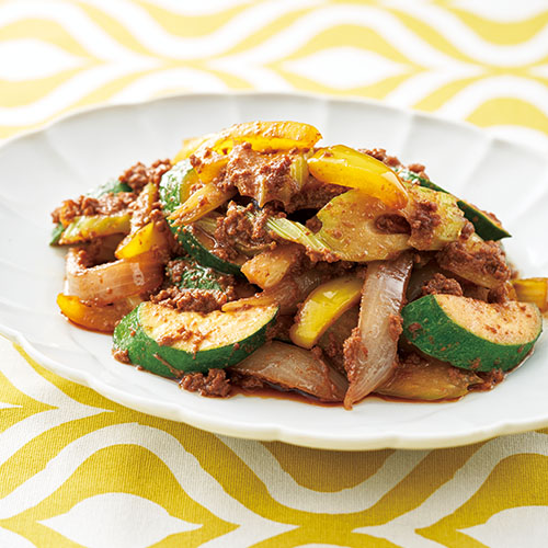 セロリ、ズッキーニ、黄パプリカを加えて、野菜の色が鮮やかになるまで炒め、器に盛る。