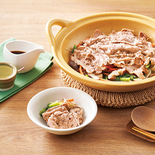豚肉ももばら切りおとし 200g もやし 200g 小松菜 100g 生しいたけ 4枚 にんじん 30g だし昆布(10cm角) 1枚 塩・あらびき黒こしょう 各適量 [A] 酒・水 各1/4カップ ぽん酢しょうゆ・七味唐辛子 各適量