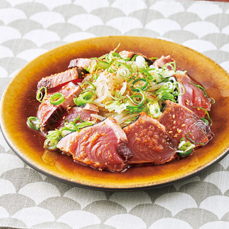 かつおのたたき 180g もやし 200g [A] しょうゆ 大さじ1 酒 小さじ2 レモンの搾り汁 小さじ1 にんにく(すりおろしたもの) 小さじ1/2 ごま油・白ごま 各小さじ1 塩・あらびき黒こしょう・青ねぎ(小口切り)・一味唐辛子 各適量