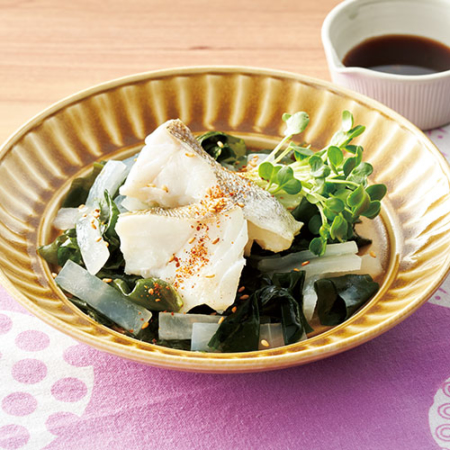 [2]にわかめを加えて、再びラップをふんわりとかけて電子レンジで約3分加熱し、ラップをかけたまま約2分おく。大根とわかめを混ぜ合わせて器に盛り、たらと貝割れをのせ、白ごま、七味唐辛子を散らす。ぽん酢しょうゆを添えていただく。