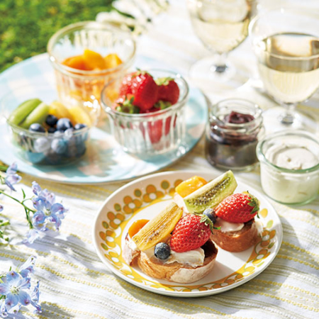 こしあん、マスカルポーネチーズをバゲットの片面に半分ずつ塗る。[1]とその他のトッピングを彩りよくのせ、きな粉を振る。