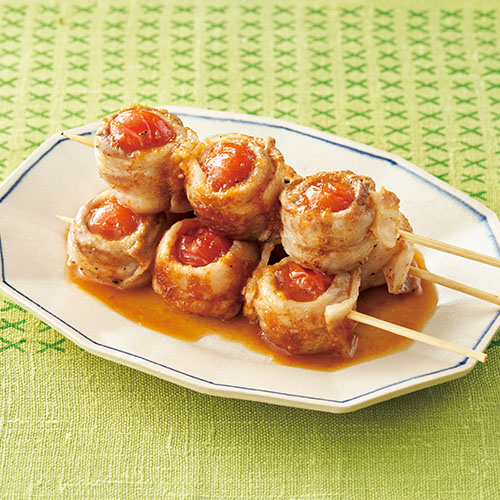 ミニトマトはヘタを取る。豚肉を半分に切って塩・こしょうをし、ミニトマトに巻きつけ、巻き終わりを竹串で刺す。3個ずつ刺して、計6本作る。