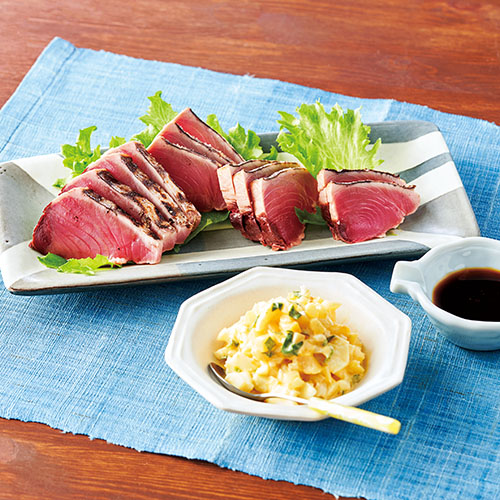 かつおのたたき 180g たくあん 50g 玉ねぎ 30g 大葉 3枚 [A] ゆで卵(あらみじん切り) 2個分 マヨネーズ 大さじ2 レモンの搾り汁 小さじ1 砂糖 小さじ1/2 塩・あらびき黒こしょう 各適量 フリルレタス 適量 ぽん酢しょうゆ 大さじ1と1/2