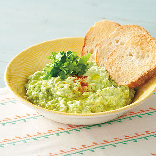 枝豆(むき身・ゆでたもの) 150g [A] マスカルポーネチーズ 30g エ キストラバージンオリーブオイル 大さじ1 白すりごま 小さじ2 レモンの搾り汁 小さじ1 豆乳 1/4カップ 塩・こしょう 各適量 エキストラバージンオリーブオイル・パプリカパウダー・香 菜(ザク切り) 各適量 バゲット(1cm厚さ) 適量