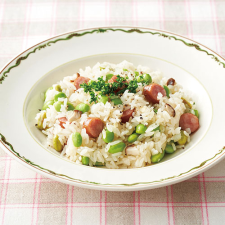 豆(むき身・ゆでたもの) 200g ソーセージ 5本 玉ねぎ 1/4個 生しいたけ 2枚 米(洗ったもの) 2合分 [A] 水 1と1/2カップ 白ワイン大 大さじ2 オリーブオイル 大さじ1 コンソメ(顆粒) 5g 塩 小さじ1/6 バター1 10g あらびき黒こしょう・パセリ(みじん切り) 各適量