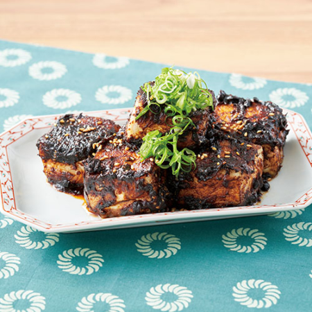 豆腐の表面に[A]の半量を塗って裏返し、裏面にも残りの[A]を塗って再び裏返し、そのまま約30秒焼く。[A]を全体に広げてまぶしつけ、器に盛り、青ねぎ、白ごまを飾る。