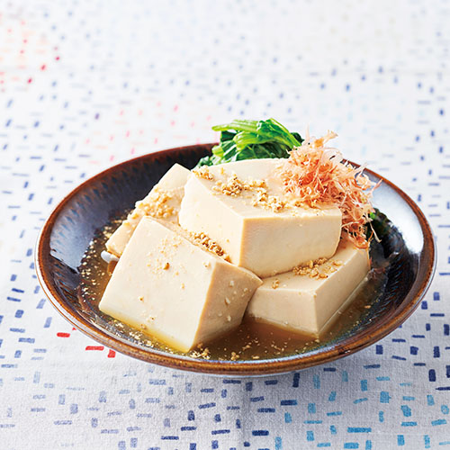 [1]の豆腐を器に盛り、残った漬け汁に[2]を入れて和え、豆腐に添える。白すりごまを振り、かつおぶしを飾る。