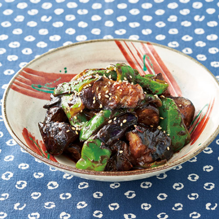 なす 3本(300g) ピーマン 4個 サラダ油 大さじ1と1/2 ごま油 大さじ1/2 赤唐辛子(輪切り) 1/2本分 [A] 赤みそ・酒・みりん・砂糖 各大さじ1と1/2 白すりごま 小さじ1 白ごま 適量