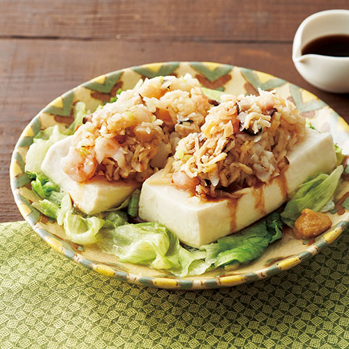 切り干し大根 20g 干ししいたけ 2枚 長ねぎ 50g むきえび 6尾 木綿豆腐 1丁(350g) レタス 3枚 [A] しょうが(すりおろしたもの)・片栗粉 各小さじ2 ごま油・しょうゆ 各小さじ1/2 塩 少々 片栗粉 適量 酒 大さじ1と1/2 ぽん酢しょうゆ・練りからし 各適量