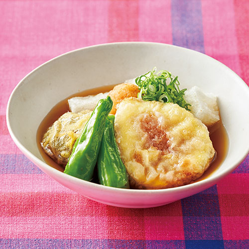 いちじく 2個 餅 2個 しし唐辛子 4本 [A] 水・薄力粉 各大さじ3 卵黄 1個分 [B] だし汁 1カップ みりん 大さじ2 薄口しょうゆ・しょうゆ 各大さじ1 薄力粉・揚げ油 各適量 青ねぎ(小口切り)・紅葉おろし 各適量