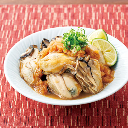牡蠣(むき身・加熱用) 10粒(200g) [A] 酒 1/4カップ 塩 小さじ1/2 [B] 大根おろし(水気を絞ったもの) 大さじ5 ぽん酢しょうゆ 大さじ2と1/2 すだちの搾り汁 1/2個分 一味唐辛子 小さじ1/3 しょうゆ・青ねぎ(小口切り) 各適量 すだち 1/2個