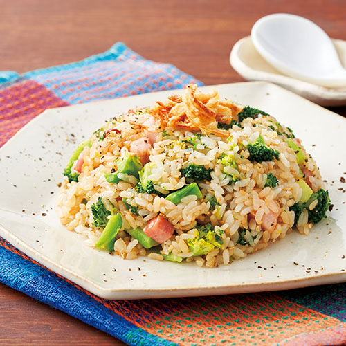 ブロッコリー 200g ベーコン(ブロック) 50g ご飯(温かいもの) 300g [A] オリーブオイル 大さじ1 にんにく(みじん切り) 1片分 赤唐辛子(輪切り) 4個 白ごま・しょうゆ 各大さじ1 塩・あらびき黒こしょう 各適量 フライドオニオン 適量