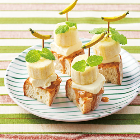 [1]のピーナッツバターを塗った面にチーズ、バナナの順にのせてピックで刺す。器に盛り、ミントを飾る。