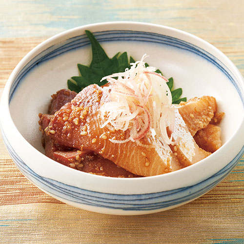 ぶり(刺身用・冊) 150g [A] しょうゆ 大さじ3 白すりごま・みりん 各大さじ1と1/2 酒 小さじ1と1/2 しょうが(すりおろしたもの) 小さじ1 大葉・みょうが(小口切り) 各適量