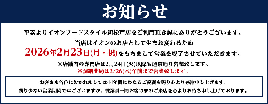 イオンフードスタイル新松戸店はイオンのお店として生まれ変わるため営業を終了させていただきます。長らくご愛顧頂き心より感謝申し上げます。