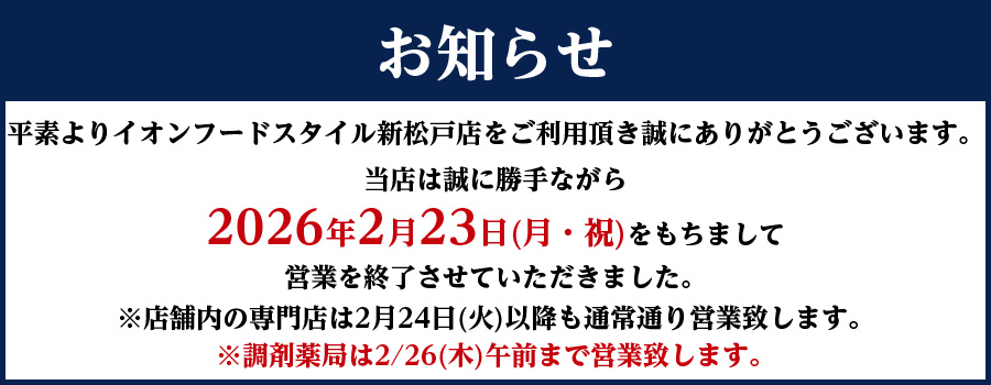 イオンフードスタイル新松戸店はイオンのお店として生まれ変わるため営業を終了させていただきます。長らくご愛顧頂き心より感謝申し上げます。