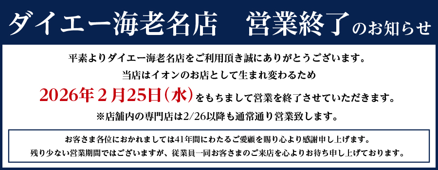 ダイエー海老名店は、イオンのお店として生まれ変わるため、2026年2月25日(水)をもちまして閉店させていただきます。