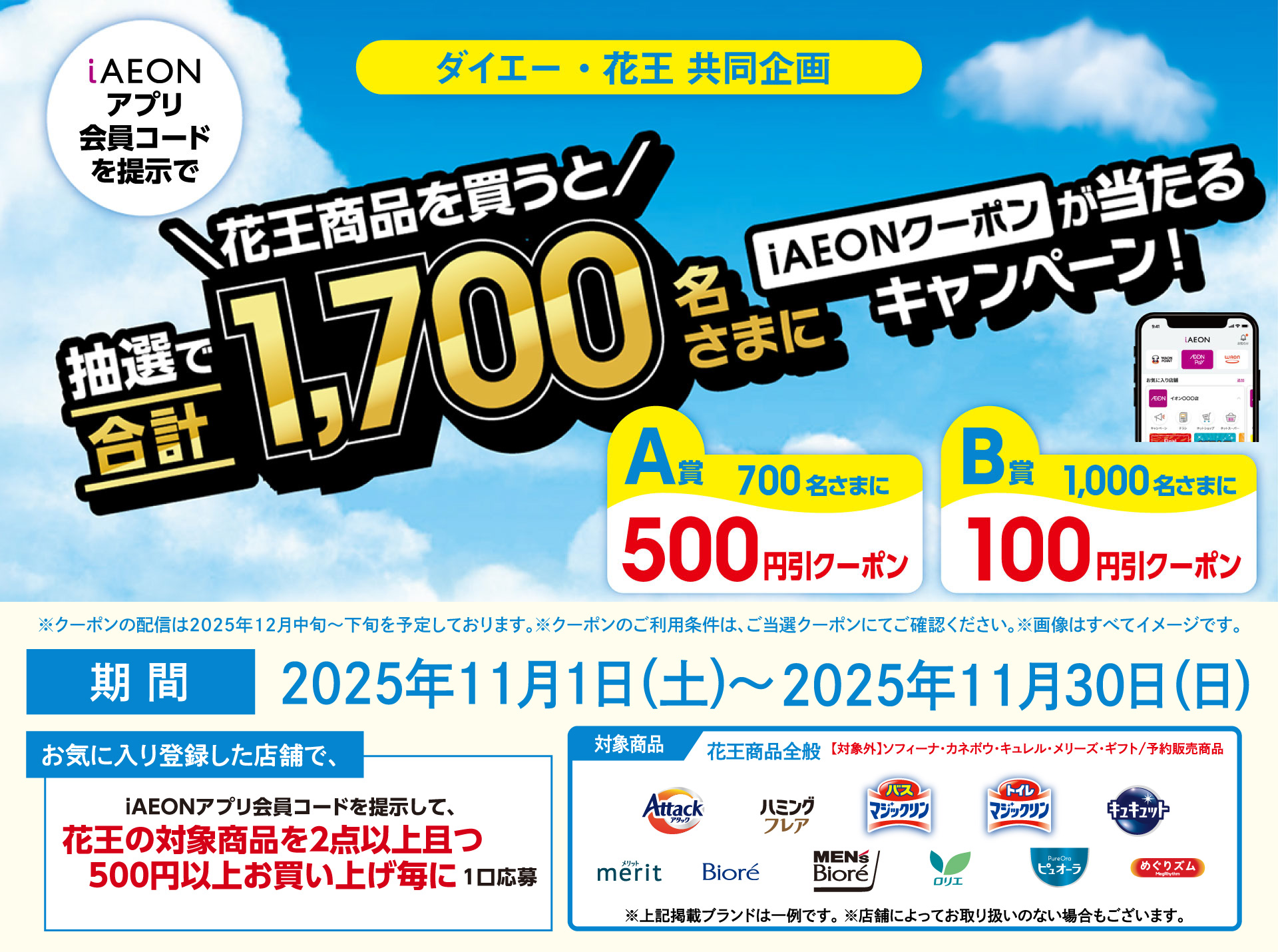対象期間中、対象店舗をお気に入り店舗に登録して、iAEONアプリの会員コードを提示の上、花王対象商品を2点以上且つ500円(税込)以上お買い上げ毎に、抽選で1,700名さまに翌月ダイエー店舗でお使いいただけるクーポンを進呈いたします。